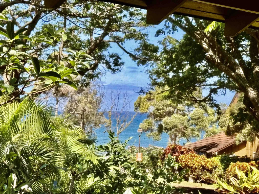 PRICED TO SELL! Tucked away in the lush landscaping this nicely maintained 1 bedroom 2 bath unit has a peek of the blue Pacific. The kitchen is fully stocked and move-in ready. Hardwood flooring, tile bathrooms, French doors open up to a screened-in lanai to enjoy the cool tropical breeze. Arch window upstairs allows for excellent light with a bonus quaint lanai offering extra breeze. Make this your home away from home.